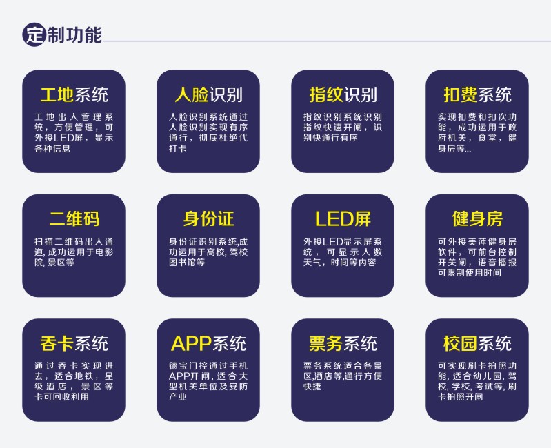 系統(tǒng)解決方案包括:大廈一卡通、小區(qū)一卡通、企業(yè)一卡通、校園一卡通等。通過覆蓋全省的銷售和服務(wù)網(wǎng)絡(luò),“HR”品牌的產(chǎn)品和系統(tǒng)以其_的功能、_的性價比和可靠性,已經(jīng)廣泛地應(yīng)用于政府、稅務(wù)機(jī)關(guān)、銀行、郵電、大型廠礦、部隊、智能小區(qū)及交通等各個領(lǐng)域,倍受各界用戶的青睞,使客戶盡情享受智能科技帶來的高品質(zhì)生活。 市場給了我們機(jī)遇,客戶給了我們發(fā)展,競爭給了我們動力。
